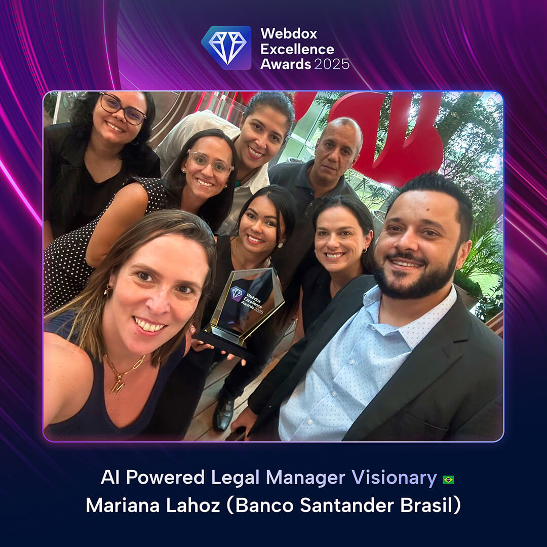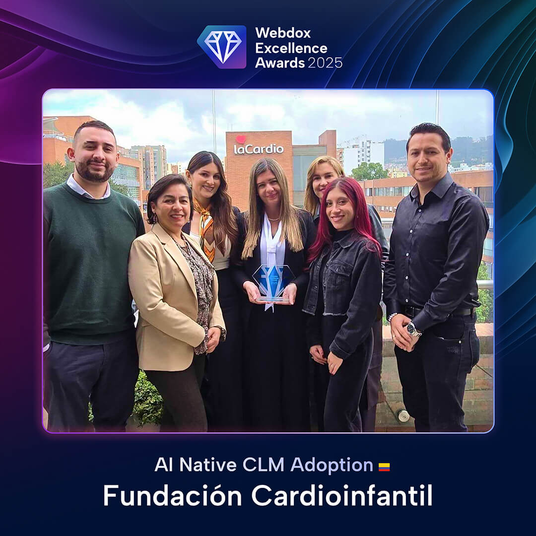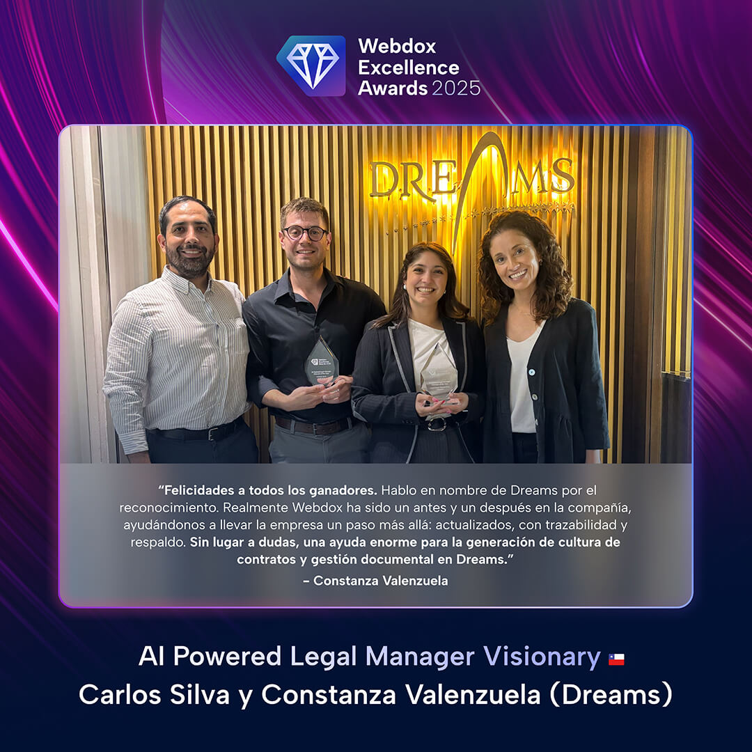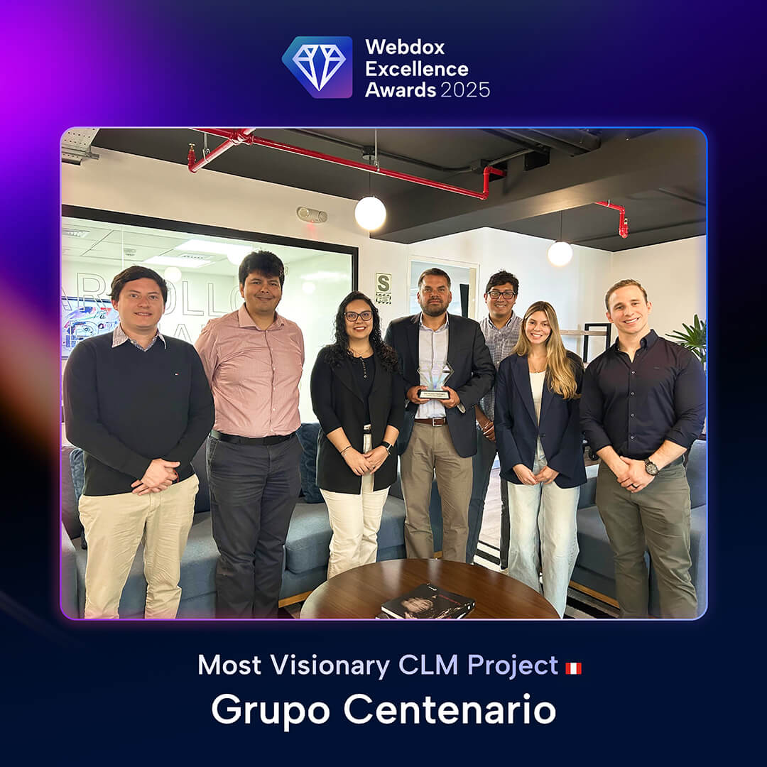 Obtener un Webdox Excellence Award valida la calidad, madurez e impacto de los proyectos desarrollados, posicionando a las organizaciones ganadoras como referentes en transformación contractual a nivel regional. Además, les permite formar parte de una comunidad de líderes que comparan prácticas, resultados y aprendizajes en torno a los más altos estándares del sector.